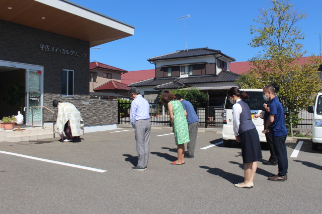 10月10日に特別養護老人ホーム宇水園、養護老人ホーム和喜久の杜、宇佐メディカルクリニックにて安全祈願祭を執り行いました。安全祈願祭は、毎年4月と10月に、執り行われています。今回は秋晴れの気持ちのよい日差しの中、ご利用者の皆さんが安全で穏やかに日々を過ごせるよう祈願しました。