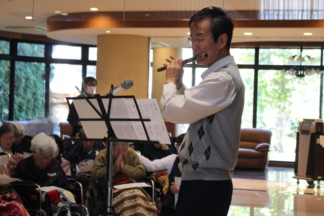 大分市に住む平賀昌幸さんが篠笛の演奏に見えました♪平賀さんはボランティアとして、大分県内の高齢者施設を演奏訪問されているそうです。「故郷」「赤とんぼ」「荒城の月」といったご利用者の皆様に馴染みのある曲目・・・懐かしい音色が宇水園に響くと、ご利用者の皆様は一緒に口ずさまれていました。皆様演奏にとても感動された様子で、お礼の言葉を伝える際には、涙を浮かべられる方もいらっしゃいました。