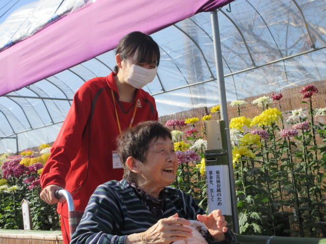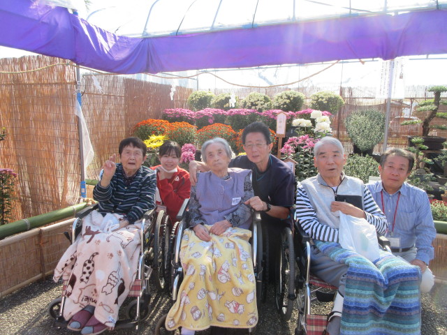 11月の初めに双葉の里へ菊花展を見に行きました!展示会場には見事な菊が並び、ご利用者のみなさんも「ほんと、綺麗やね~」「見に来れてよかったわ」と喜んでいらっしゃいましたこの日、インターンシップに来ていた生徒さんも外出し、いつも施設内で過ごされているご利用者が外の景色や季節を感じる時間を一緒に体験してもらいました。お孫さんくらいの年齢にあたる生徒さんが居ることでご利用者のみなさん笑顔で、ますます楽しい時間になったようでした☺